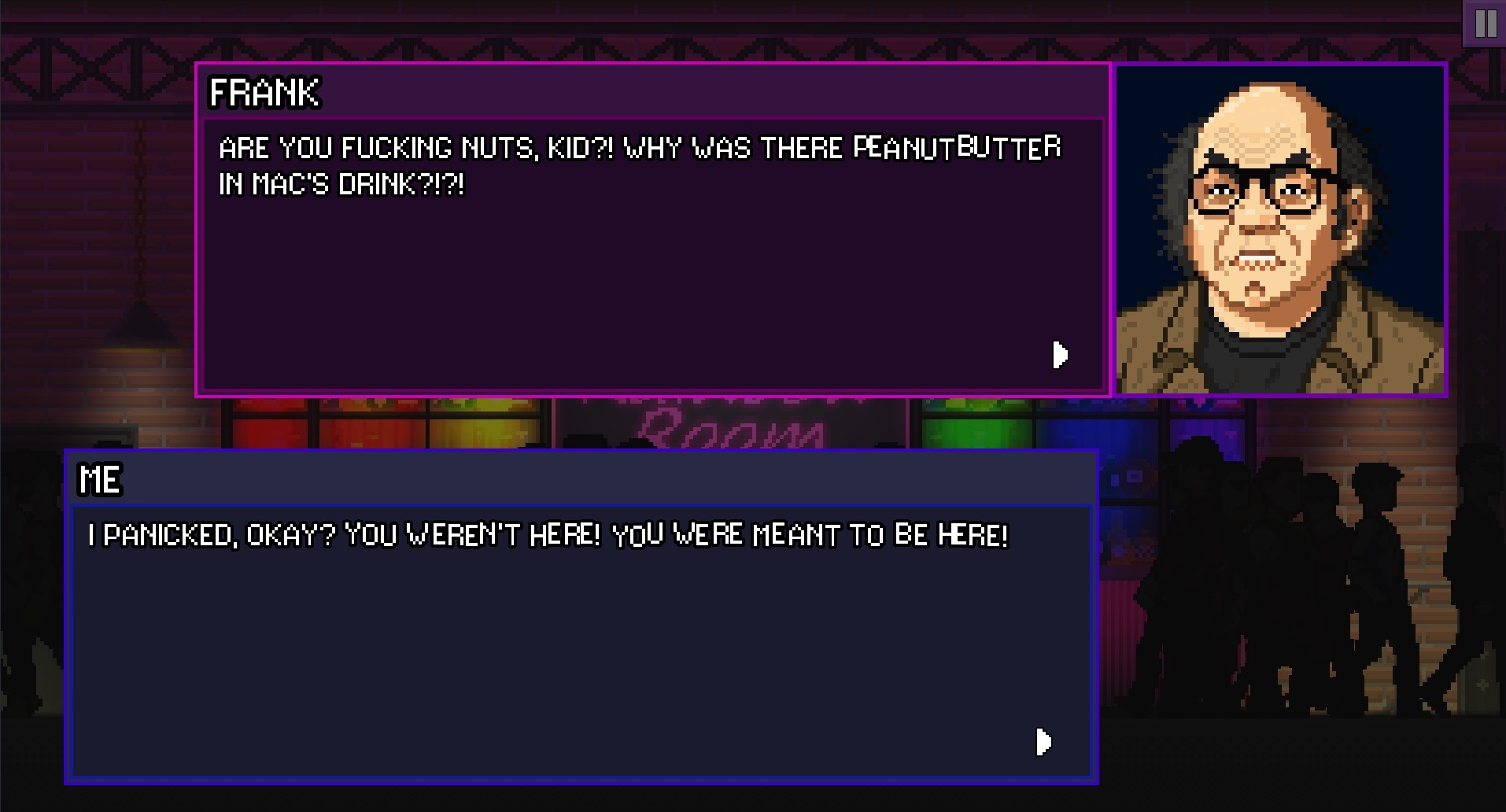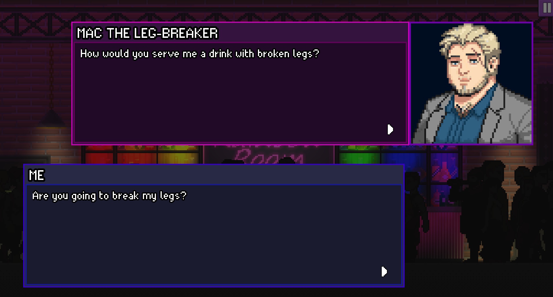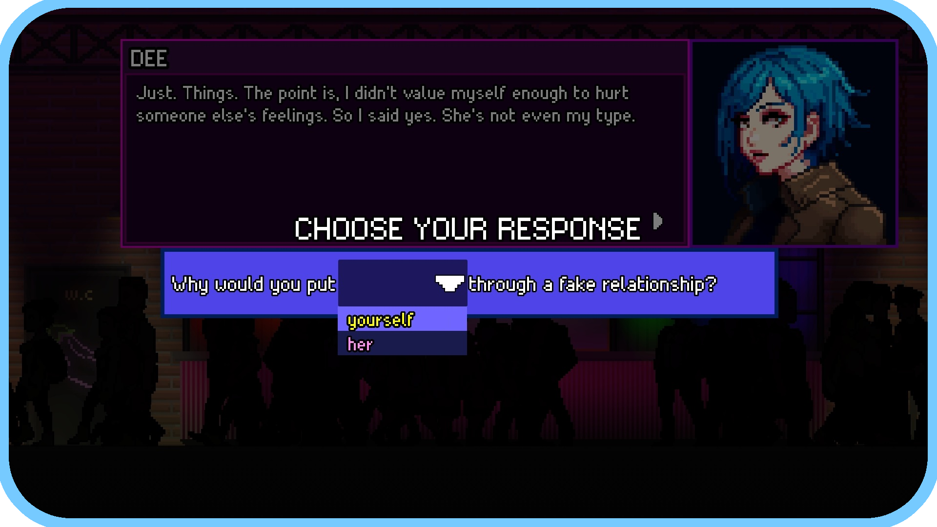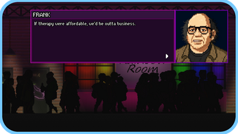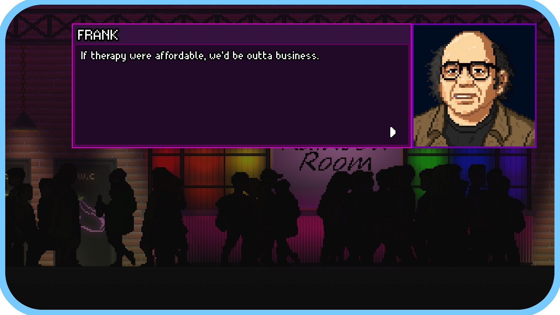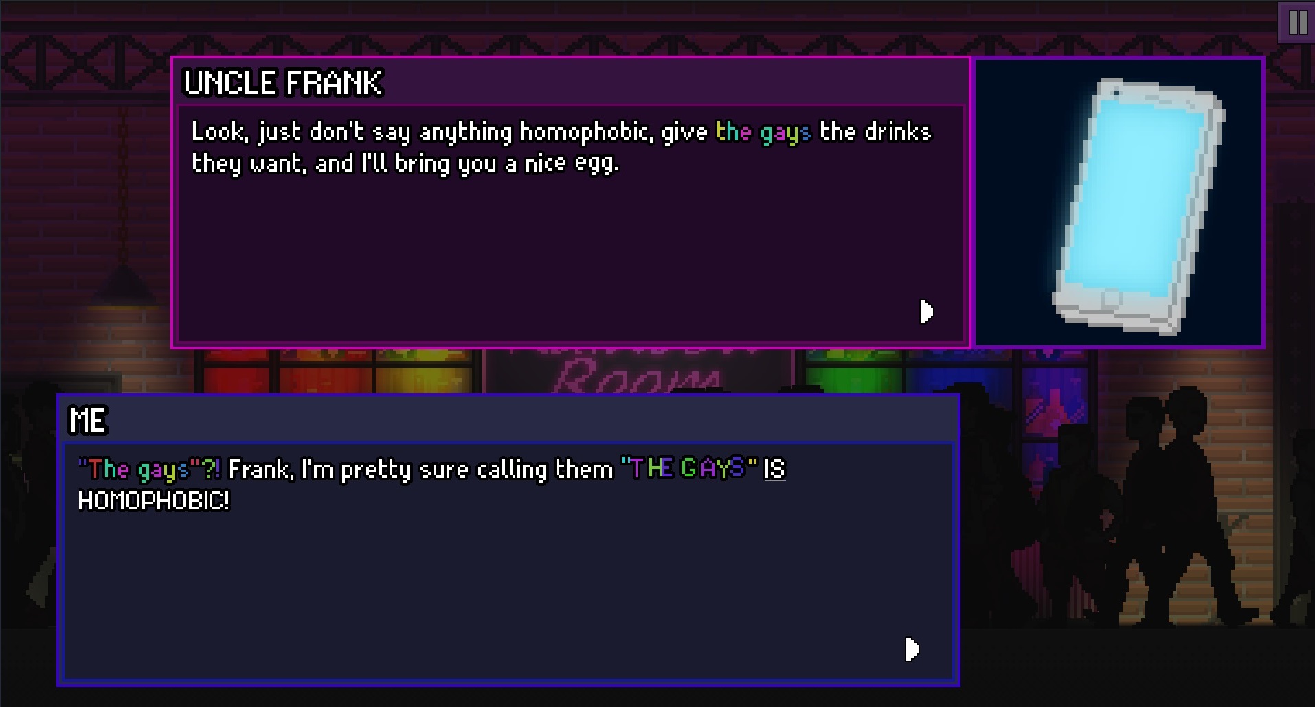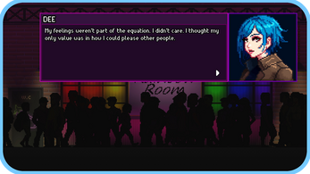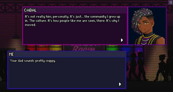 This is a prototype to gauge whether people are interested in a queer-centric interactive fiction with down to earth themes. If you like the sound of that, let us know! We'd love to add more characters, dialogue, bar art and minigames to Rainbow Room, if we see people want more :)